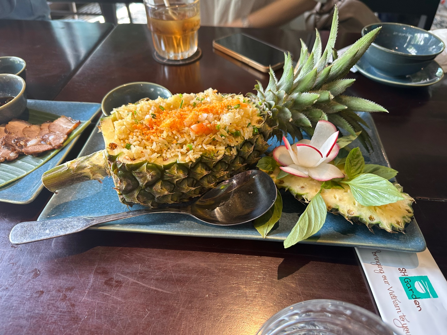 대통령궁을 갔다가 점심에는 베트남식 레스토랑을 갔다. SH가든 이라는 곳이 었는데 , 파인애플 볶음밥부터해서 반새오 (베트남 식 부침개요리) 마늘볶음밥 , 한국식의 보쌈 , 모닝글로리요리 등 다양한 음식들이 있었다. 우리는 파인애플 볶음밥 , 반새오 , 모닝글로리 볶음 마늘볶음밥 , 보쌈같은 것 들을 시켰고 , 처음 먹는 음식들이라 입에 안맞을까 걱정을 많이 했는데 정말 맛있었다. 특히 마늘볶음밥은 한국의 밥과는 달리 고슬고슬한 튀긴밥 같은느낌이 강했었는데 그 부분 또한 마음에 들었다,